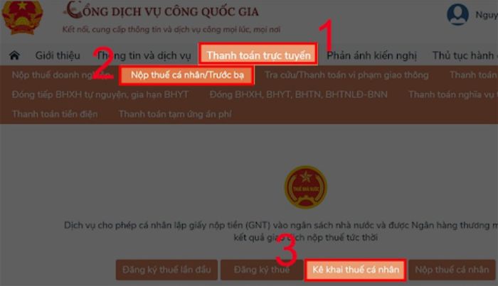 Chọn Thanh toán trực tuyến, Nộp thuế cá nhân/Trước bạ, Kê khai thuế cá nhân