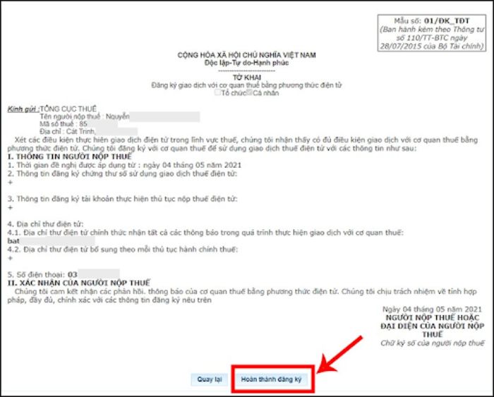 – Bước 4: Website sẽ nhanh chóng xuất hiện Tờ khai giao dịch với cơ quan thuế bằng phương thức điện tử. Bạn cần kiểm tra lại toàn bộ thông tin có chuẩn xác không rồi nhấn vào Hoàn thành đăng ký.