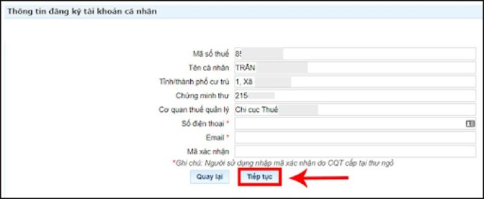 – Bước 3: Ở giao diện màn hình có các ô trống thì bạn cần điền đầy đủ thông tin về số điện thoại, email, mã xác nhận rồi nhấn Tiếp tục.
